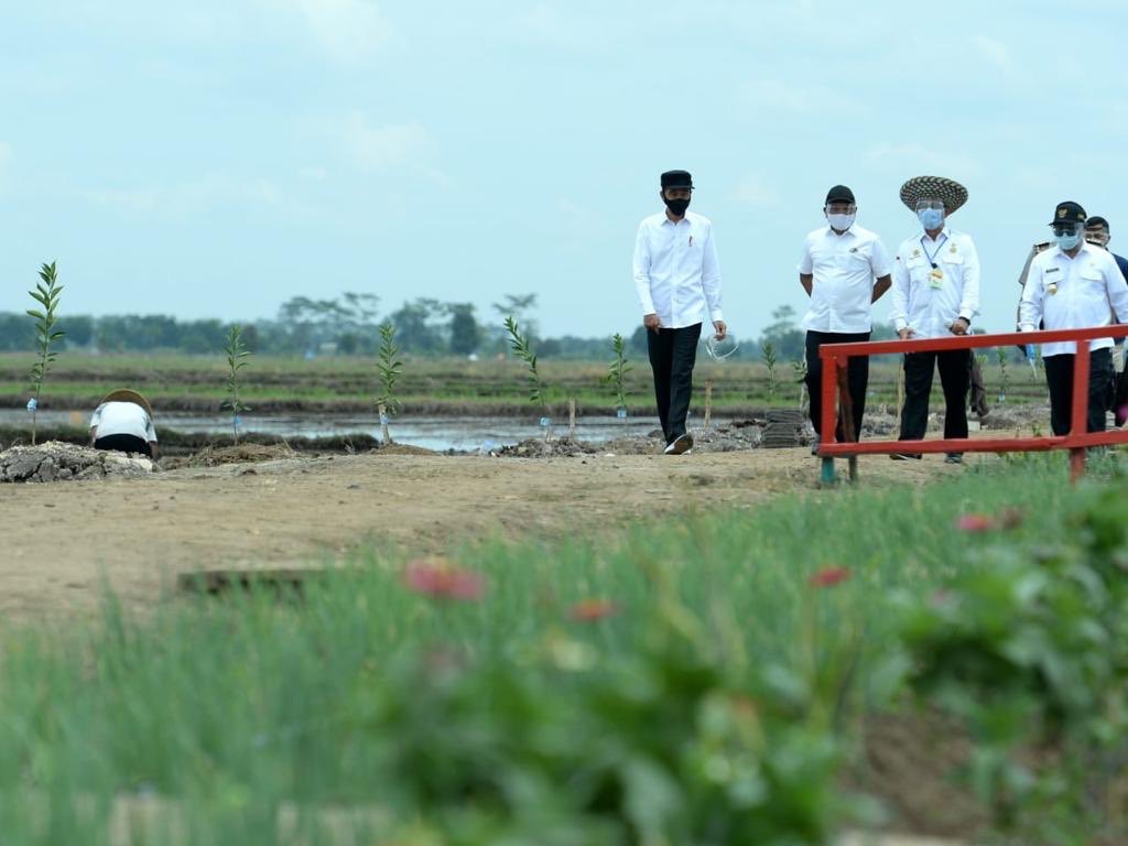 Di Belanti Siam, Pulang Pisau, Presiden yang tampak didampingi oleh di antaranya Menteri Pertanian Syahrul Yasin Limpo, Kepala Staf Kepresidenan Moeldoko, dan Wakil Gubernur Kalimantan Tengah Habib Ismail Bin Yahya menyaksikan pengolahan lahan rawa dengan menggunakan traktor apung khusus untuk kemudian berlanjut pada penanaman padi menggunakan mesin penanam padi otomatis atau rice transplanter hingga pemupukan yang dilakukan dengan memanfaatkan teknologi nirawak atau drone.
